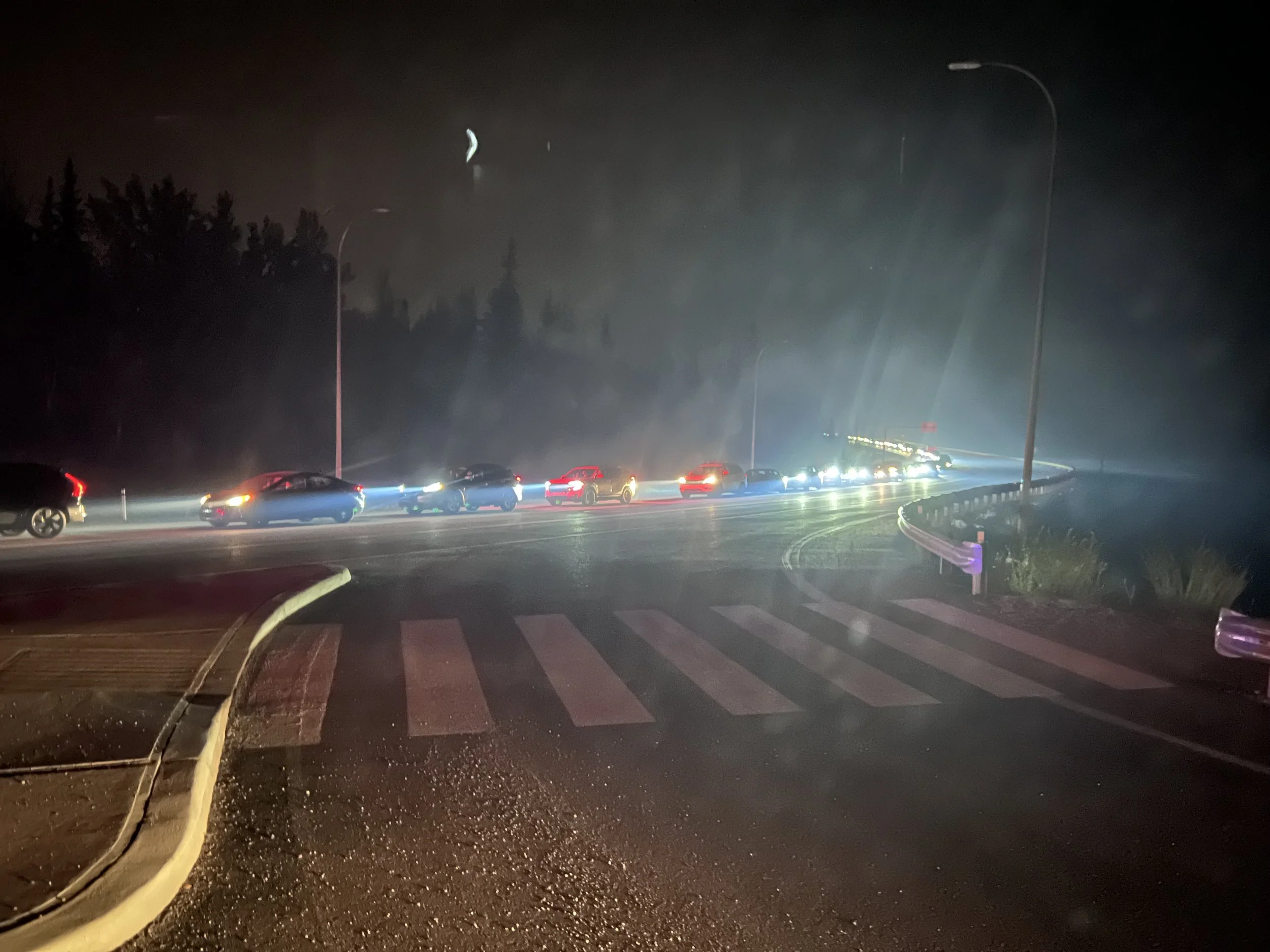 Driving in the dark with the thousands of others I’m not sure our driver knew where to go at first—just get us away. A light rain had begun to fall as we made our way to Valemount about 3 am, the first community west of Jasper. Many others had stopped for gas, a snack and a washroom. Lots of Jasper locals had decided to sleep in their cars at Valemount. All of us were dazed, sleepy, frightened. The electronic signs over the roadway were telling evacuees to go to Prince George so we headed there—hours away. Our bus driver bought some Red Bull in efforts to stay awake driving all night. I was just two seats behind him ready to kindly pop him in the back of the head if he dozed off.