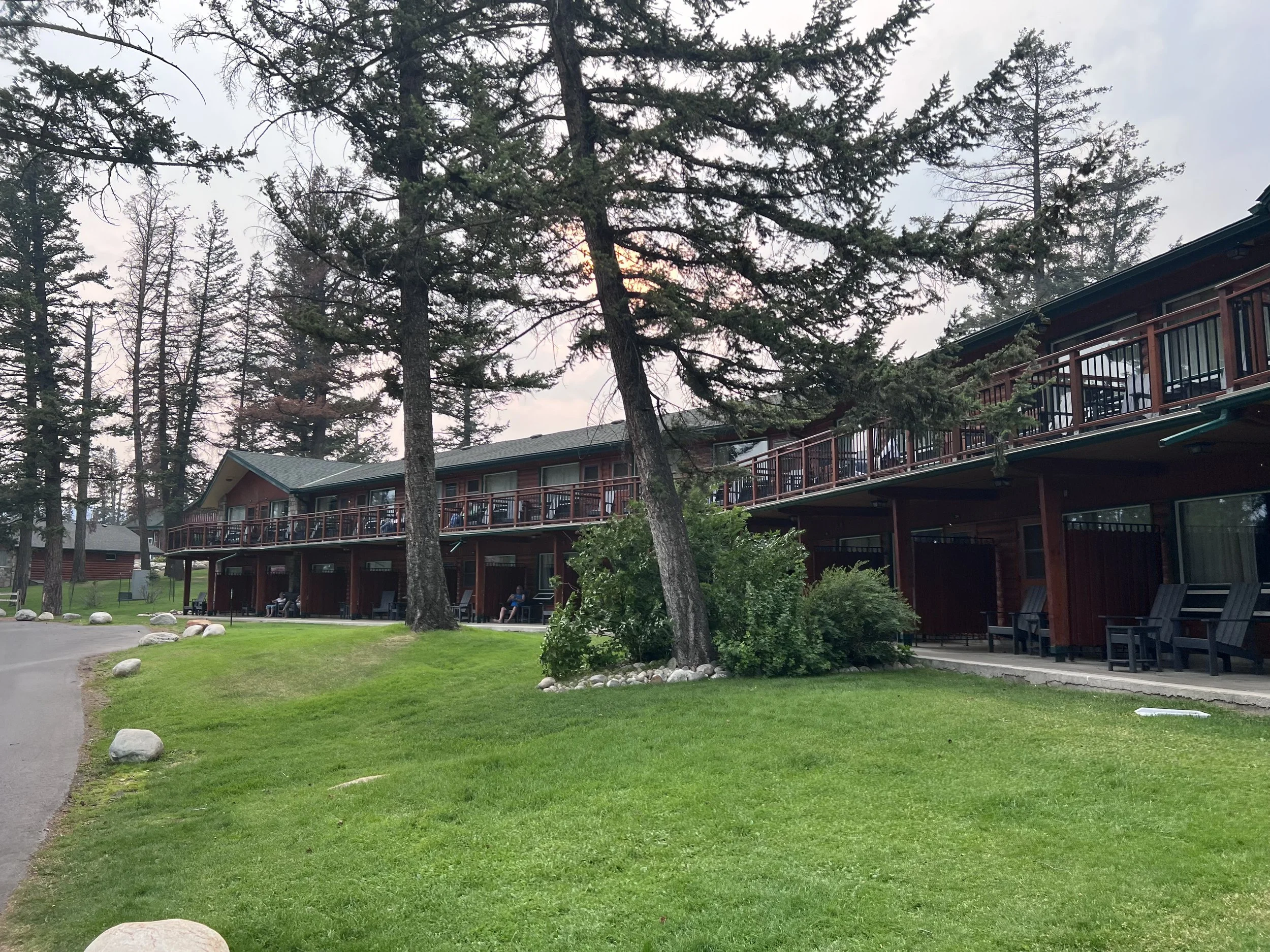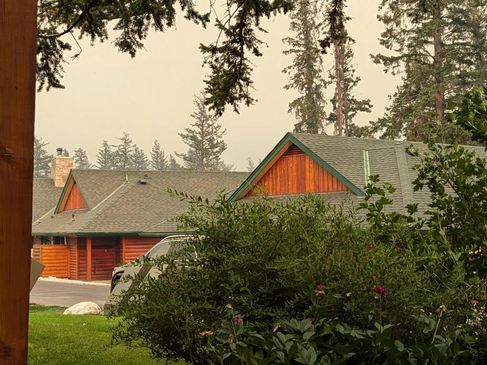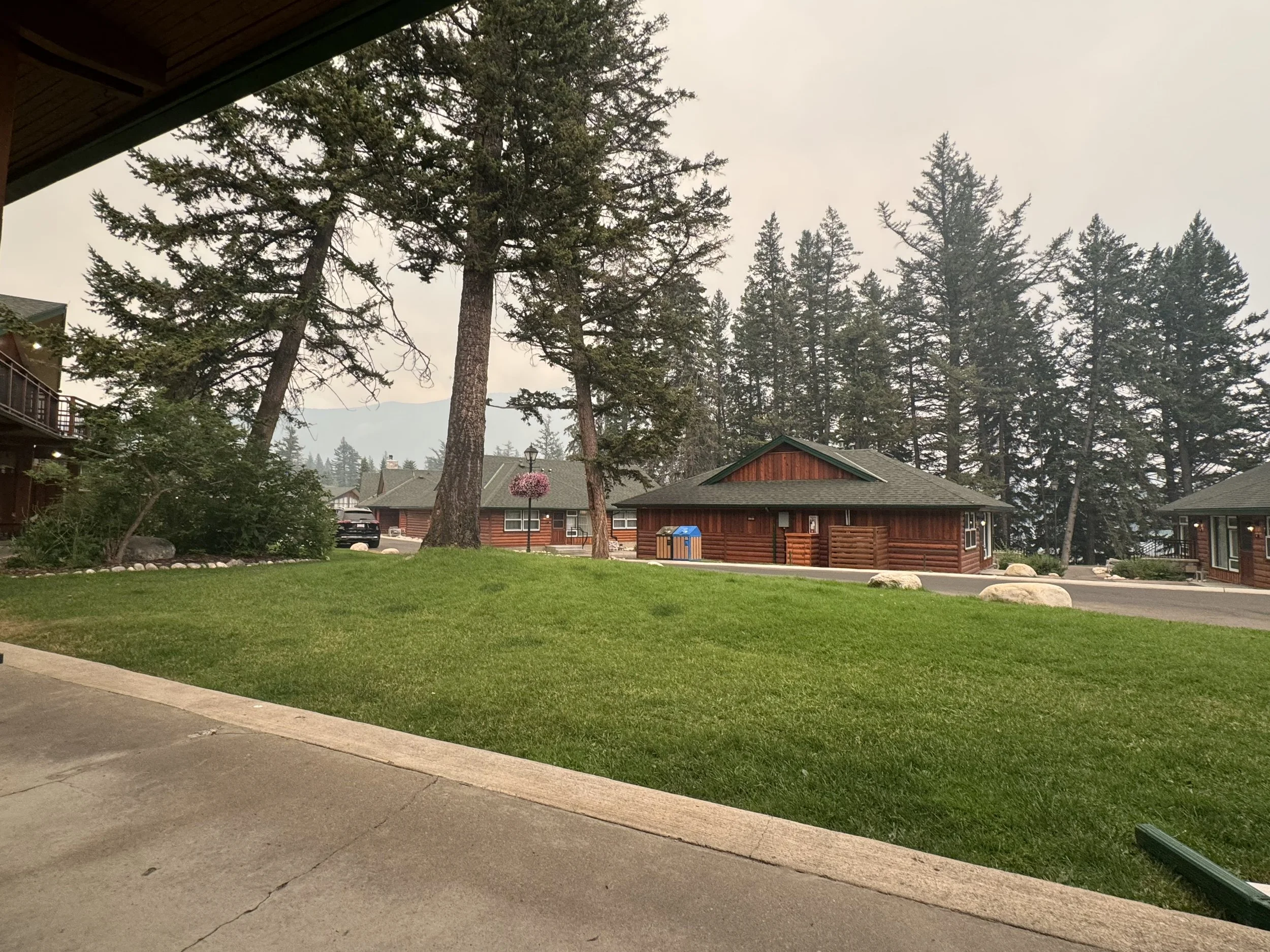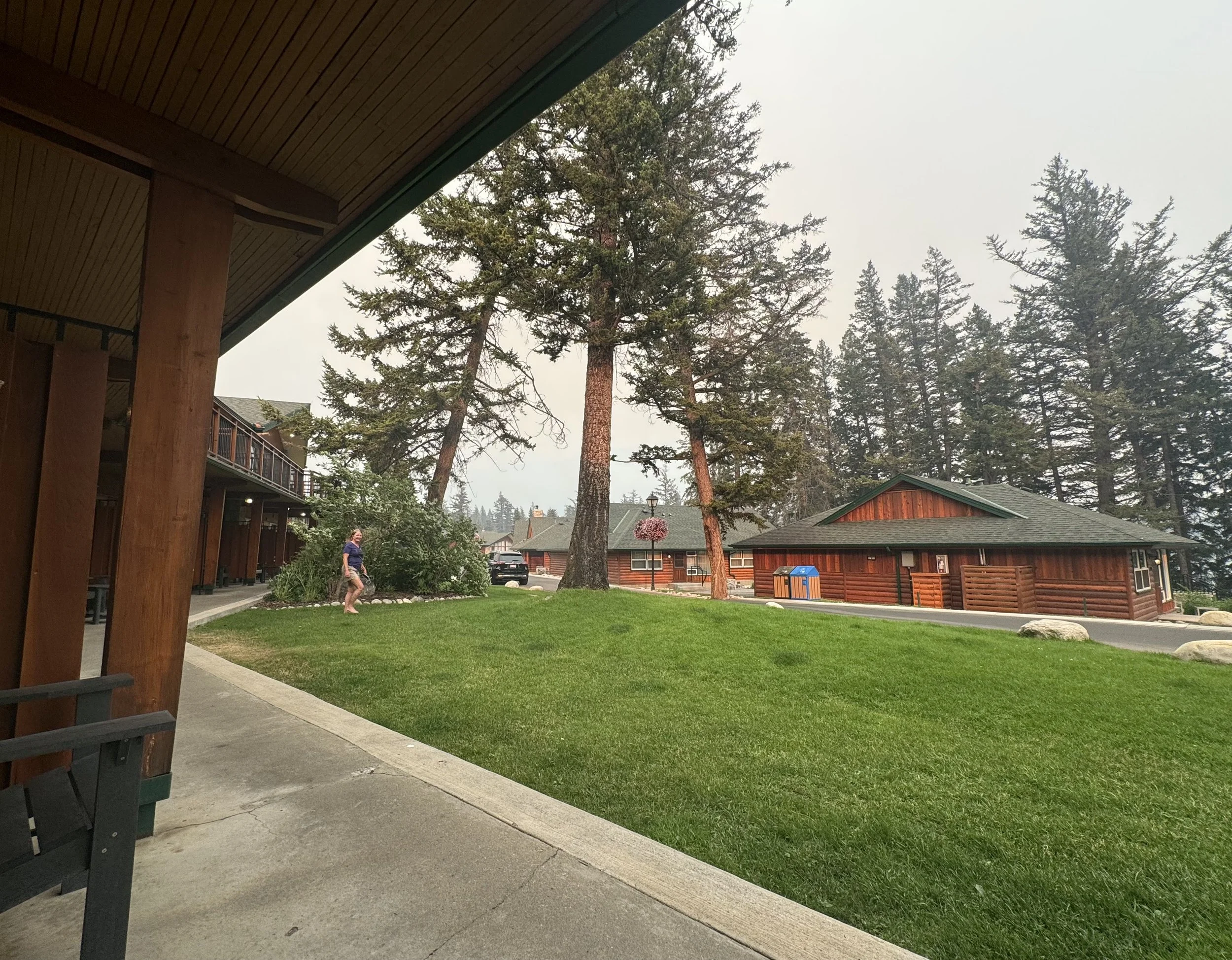Arriving back to the resort, not being that hungry, we bought a bag of chips and a turkey sandwich at their ‘grab and go’ to take back to our room and split. As we finished our sandwich around six the electricity went off, the whole resort. I slipped out to sit on our porch. A strong wind had come up cooling things down ever so slightly. It was strong enough to blow the down spout I was sitting next to off the building. The tall spruce trees were swaying back and forth. The electricity came on, then soon off again—then later back on. This was our first warning that something was up. A couple from Kansas City—Kim and David, was in the room two doors down from us. They came over to speculate about the electricity, the wind and the smoke it was blowing in. Mountains that had been visible only minutes before disappeared. The smell of smoke was strong in our nostrils. Fine ash began falling on our clothing. In retrospect, this was the time to take some action. My thoughts were “if ash is falling the fire can’t be all that far away”.