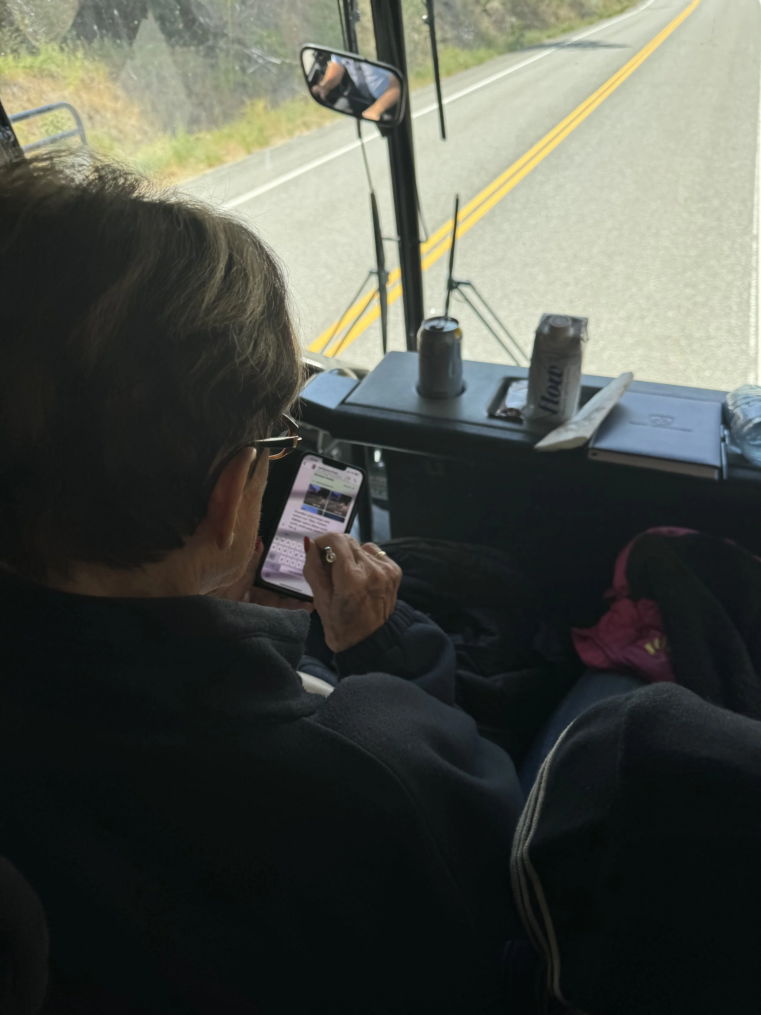 Once to the highway we joined miles of headlights in every direction, stopped. Wedging our way in, we sat staring at tail lights for near an hour barely inching along. I had downloaded Jonathan Vigliotti’s new book, BEFORE IT IS GONE. It is about the effects of climate change that he’d reported on for CBS. I’d just finished the first section about fire reading about the Paradise California fire—the whole town going up in flames. As we waited in the jam of traffic I recalled his report of people dying in their cars trying to escape the fire. Not the book to read before being launched into a fire evacuation. I kept my thoughts to myself. Later, Jeannie said she had thought about calling our daughters to say goodbye but it was middle of the night for them so we chose to text. We’d decided to have only one of our iPhones on during the trip, mine. I told Jeannie to get her phone out and make sure it was charged since we had no idea what we were facing. I’d taken but wasn’t wearing my Apple Watch. I charged it too. We’d lucked out on a bus with charging ports.