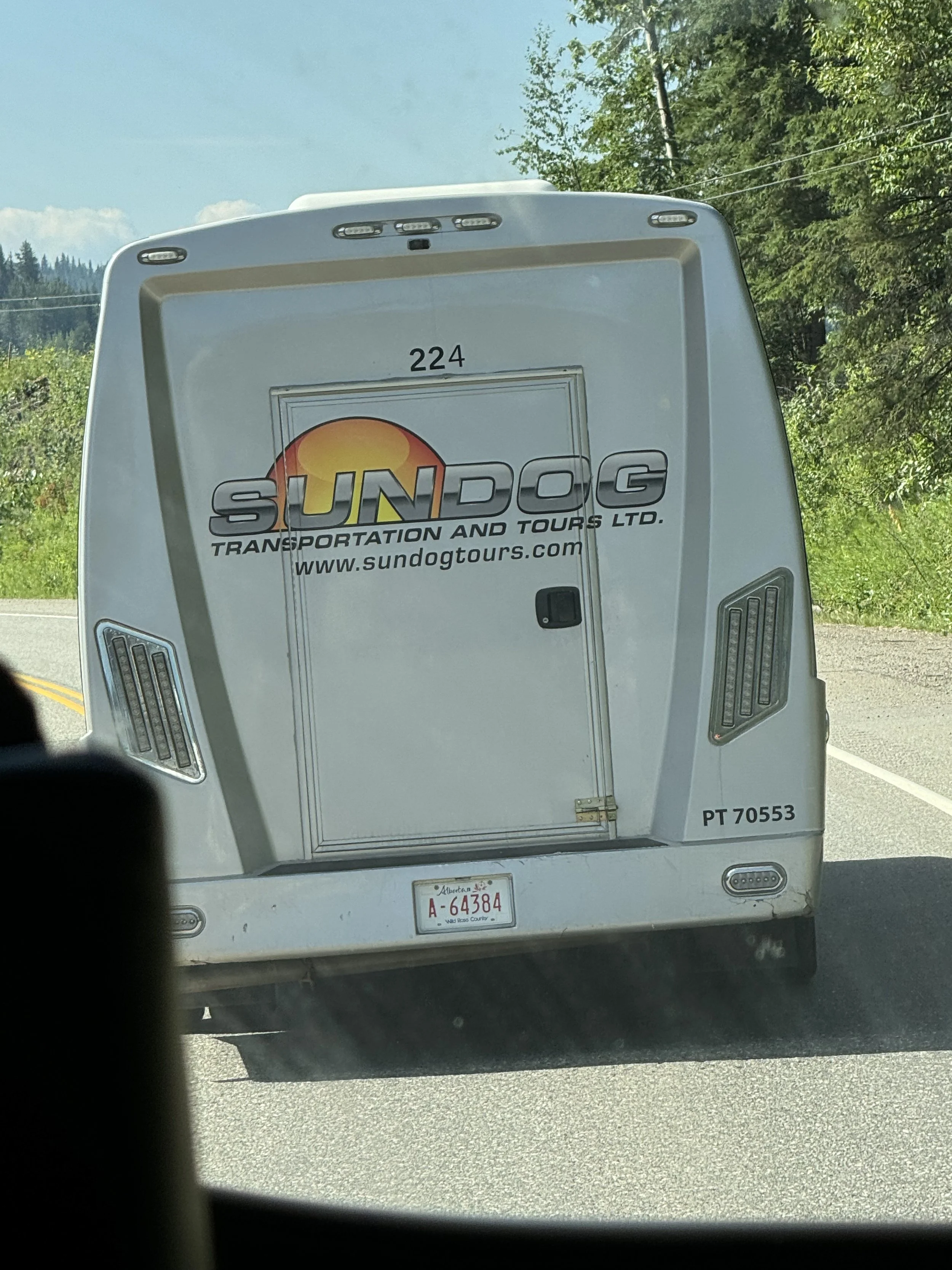 We were deep asleep when Kim banged on our door saying they’d got an alert on their phone that the town of Jasper and the resort was being evacuated. My phone had been silent. It was around 10:30 pm. Jeannie phoned the front desk who said get to the main lodge. We threw what was left into our luggage—glad we done most of our packing before bed. As we were rolling luggage outside two strangers in the street offered to help roll luggage in the darkness. When we got to the lodge one of our ‘suitcase rollers’ asked what group we were with. We said Rocky Mountaineer but really on our own since there was no guide or representative. We spotted Kim and David getting on a bus and fell in behind them since they were to be on the train as well. It was chaotic. No signs on any of the many buses. No hotel staff offering directions—in fact, staff were piling onto buses as well. Getting our luggage onto to what had been a tour bus that day we climbed on. Our Asian driver spoke broken english —but in our situation, he could drive a bus!